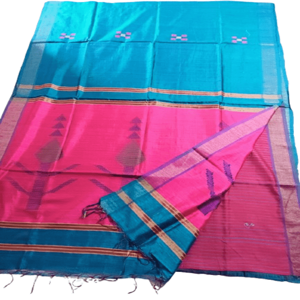 A tussar dupion silk saree is a blend of wild tussar silk and cultivated dupion silk, combining the rustic texture and earthy, golden sheen of tussar with the crisp, irregular texture of dupion. This blend creates a lightweight, breathable, and durable fabric that drapes elegantly and resists wrinkles. The saree is prized for its unique slubbed texture and ability to carry rich, natural colors and intricate embellishments like zari and embroidery. It is a versatile and sophisticated choice for both formal and festive events. Location : Bihar, India