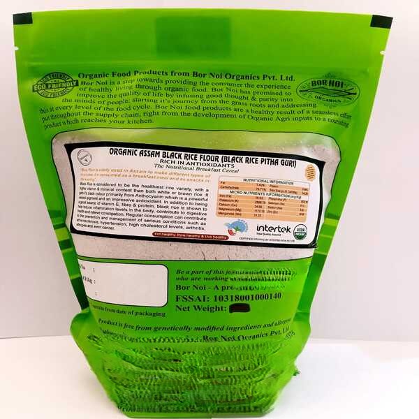 281 Packet Net Weight : 750 Gram Description : Black Rice Flour Is A Gluten-free Flour Milled From Black Rice, Also Known As Forbidden Rice Or Purple Rice. It Is A Nutrient-rich Flour With A Slightly Nutty Flavor And A Deep Purple Hue. It Is A Good Source Of Antioxidants, Fiber, And Essential Vitamins And Minerals. Black Rice Flour Is Rich In Antioxidants, Particularly Anthocyanins, Which Are Known For Their Health Benefits. It Also Provides A Good Source Of Fiber, Protein, And Essential Vitamins And Minerals Like Iron And Potassium. Besides Its Antioxidant Properties, Black Rice Flour May Aid In Digestion, Improve Heart Health, And Help Regulate Blood Sugar Levels Due To Its Fiber Content. It Can Also Be A Good Option For Weight Management As It Can Help With Satiety And Curb Cravings. Location : Assam, India