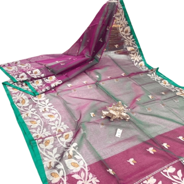 A muslin jamdani saree is a premium handwoven fabric, traditionally made from the finest, softest cotton muslin. Originating in the Bengal region, these lightweight and translucent sarees feature intricate, vibrant motifs woven directly into the fabric using a supplementary weft technique. This labor-intensive process, which can take several months, results in patterns that appear to float on the fabric. Renowned for its elegance and breathable quality, this textile art received UNESCO recognition in 2013 and is a symbol of cultural heritage in both Bangladesh and West Bengal. Location : West Bengal, India