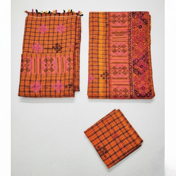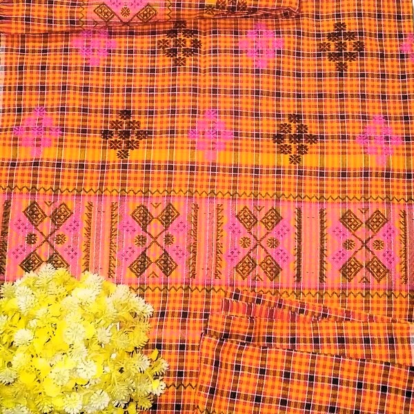 A Padmini cotton mekhela chadar is a traditional, handwoven two-piece attire from Assam, India, made from soft, breathable Padmini cotton fabric, featuring unique handloom designs, and consists of a cylindrical skirt-like mekhela worn from the waist down and a chadar draped over the upper body and head. This comfortable garment, which includes a separate blouse piece, is ideal for daily wear, especially in hot climates. Location : Assam, India