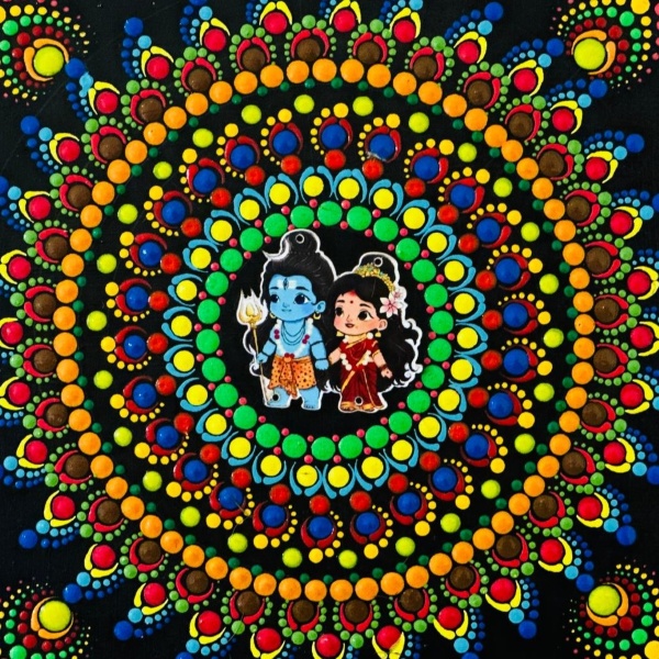 880 Piece Description : A Gauri Shankar Dot Mandala Wall Painting Is A Vibrant And Meditative Artwork Depicting The Divine Union Of Lord Shiva (shankar) And Goddess Parvati (gauri) Using The Intricate And Spiritual Technique Of Dot Mandala. It Combines The Sacred Symbolism Of The Cosmic Couple With The Calming, Therapeutic Process Of Dot Art, Resulting In A Piece That Is Both Aesthetically Beautiful And Spiritually Meaningful. Location : New Delhi, India