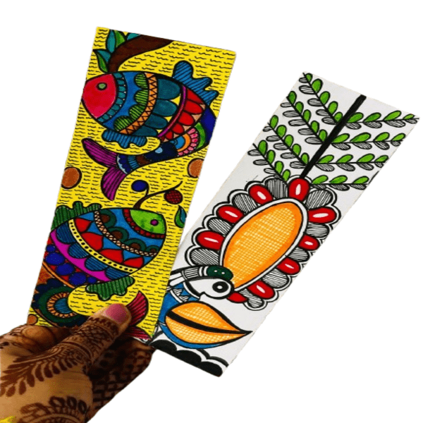 Madhubani bookmarks are decorative, often handmade accessories featuring intricate, hand-painted Mithila art, a traditional Indian folk art style from Bihar. Typically made on paper, often handmade or recycled, these bookmarks use vibrant colors and motifs inspired by nature, mythology, and daily life. They serve as both functional tools for readers and artistic pieces that promote Indian heritage and craftsmanship. Location : New Delhi, India