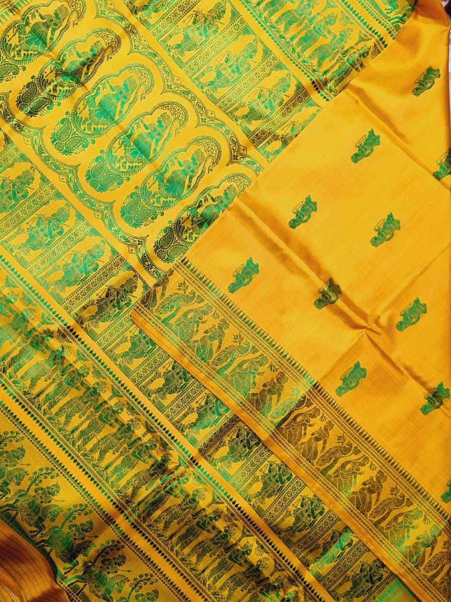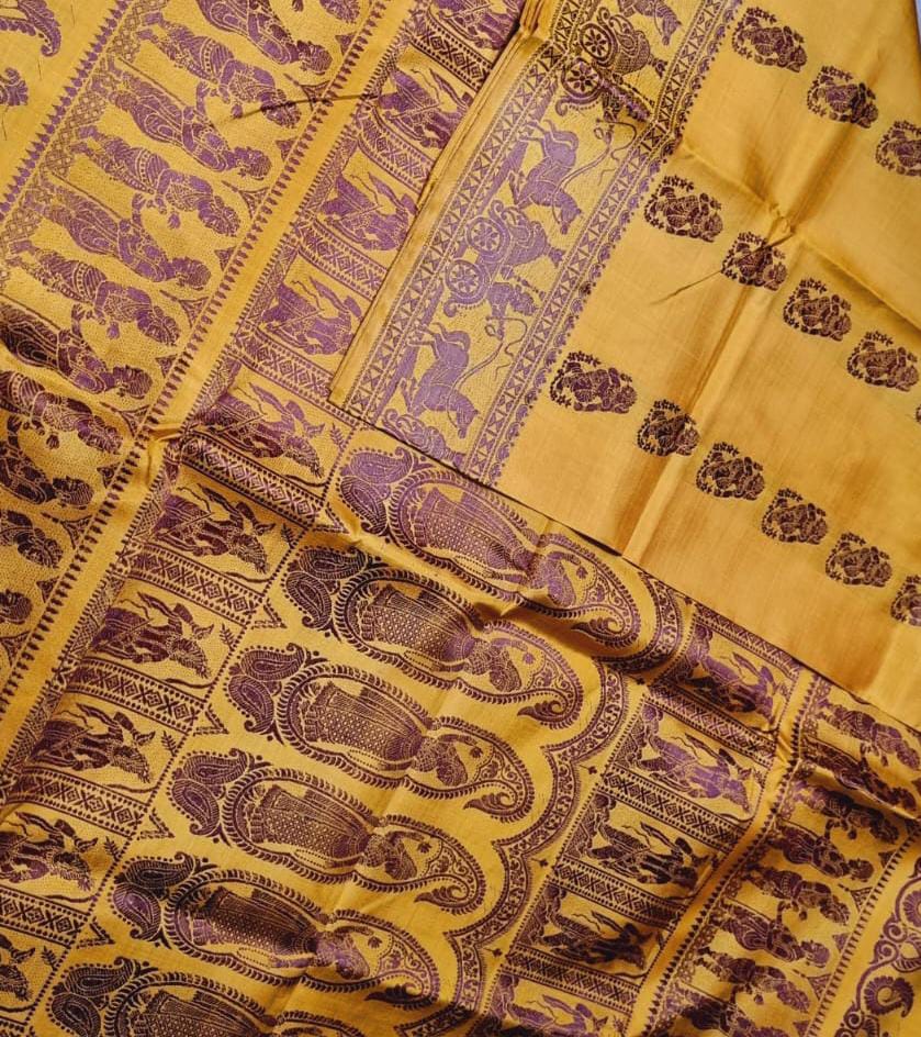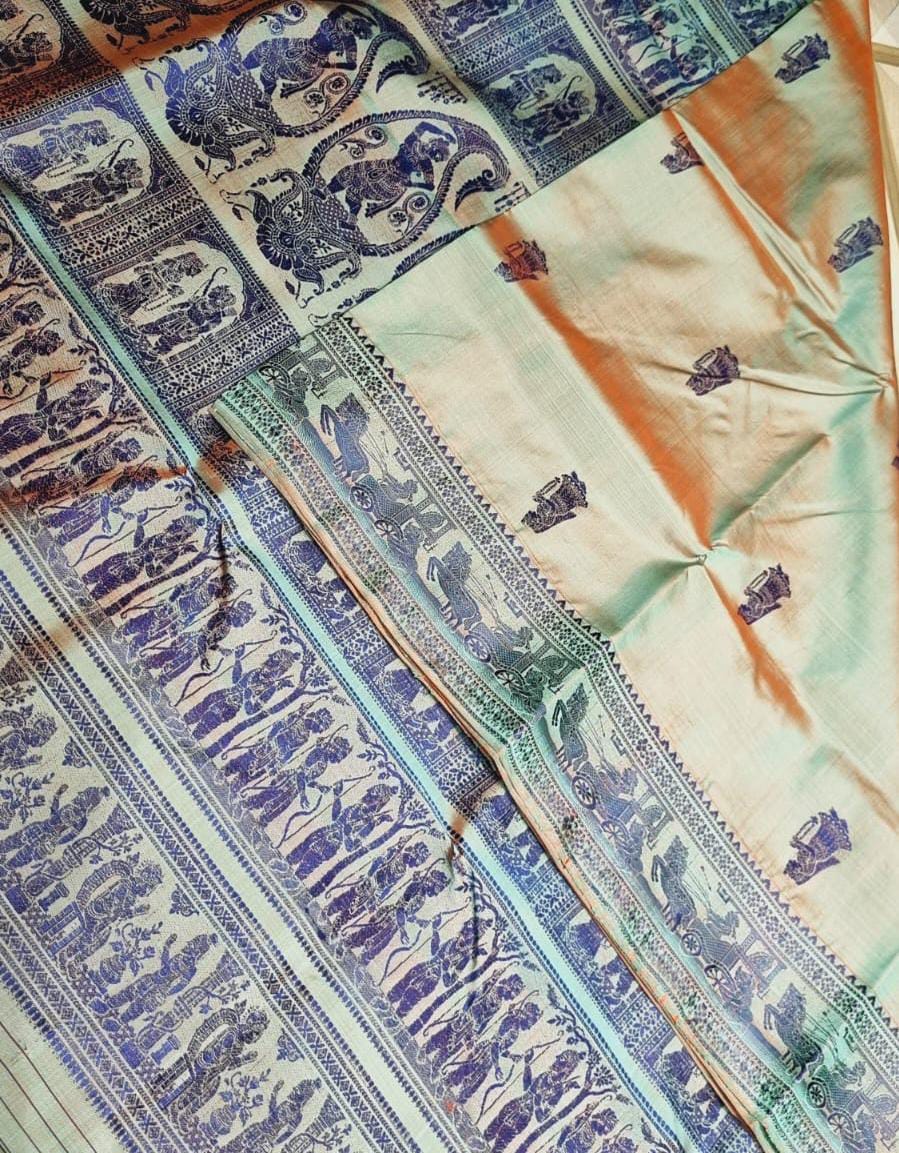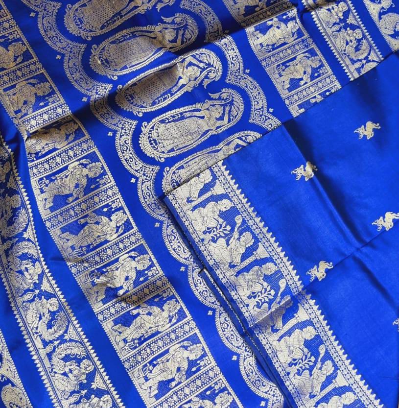 7700 Piece Description : Baluchari Saris Illustrate Hindu Mythological Scenes, Nature, Folklore, Legends, Historical Events, And Abstract Designs. They Showcase Gods, Heroes, Nature Elements, Love Stories, Battles, And Contemporary Patterns. Location : West Bengal, India