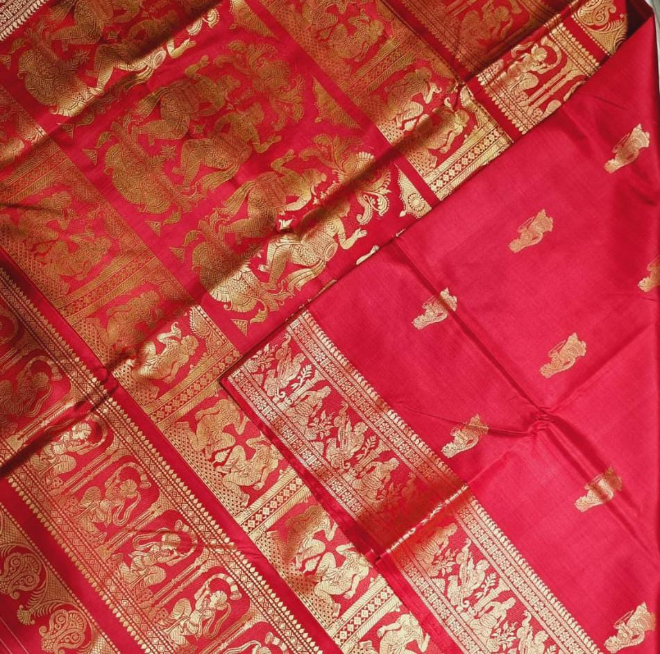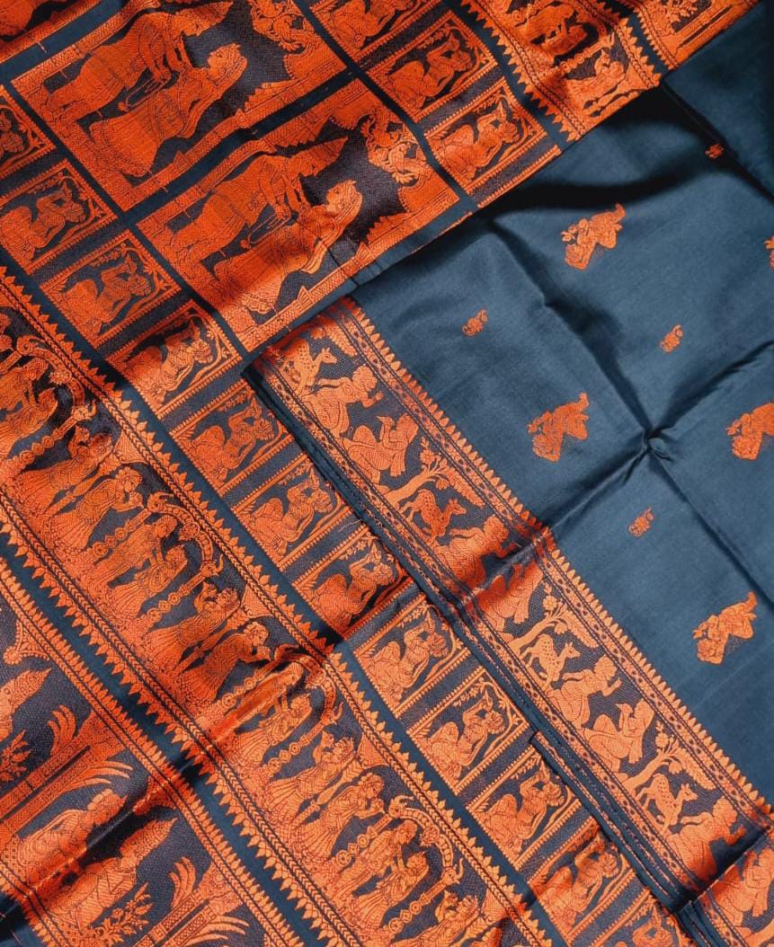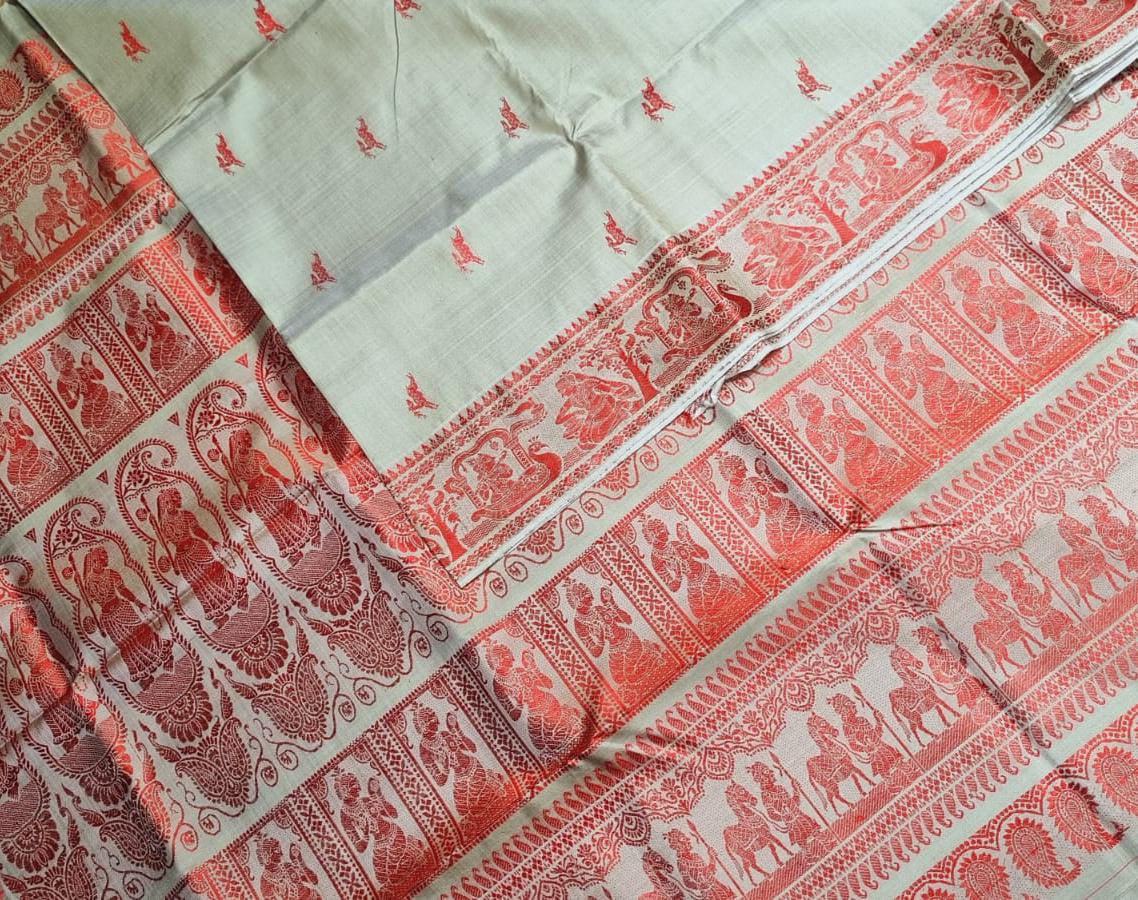 7700 Piece Description : Baluchari Saris Illustrate Hindu Mythological Scenes, Nature, Folklore, Legends, Historical Events, And Abstract Designs. They Showcase Gods, Heroes, Nature Elements, Love Stories, Battles, And Contemporary Patterns. Location : West Bengal, India