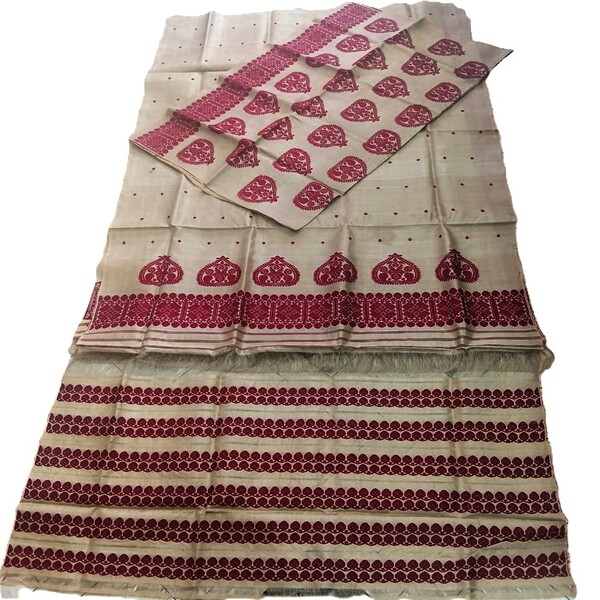 A pure toss mekhela chadar is a traditional Assamese outfit made from 100% tussar silk, a natural silk known for its golden sheen and coarse texture. It is a two-piece garment consisting of a mekhela (a cylindrical sarong-like piece wrapped around the waist) and a chadar (a long piece of fabric draped over the body, similar to a sari). The set typically includes a separate blouse piece. Location : Assam, India