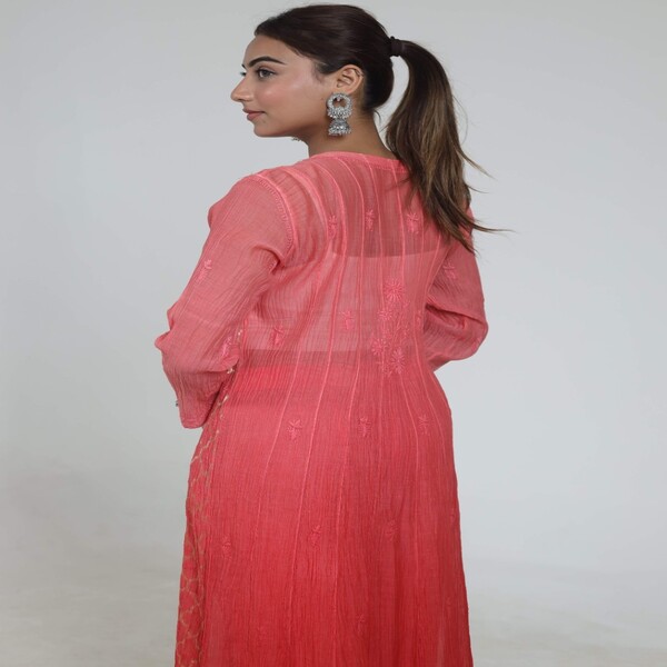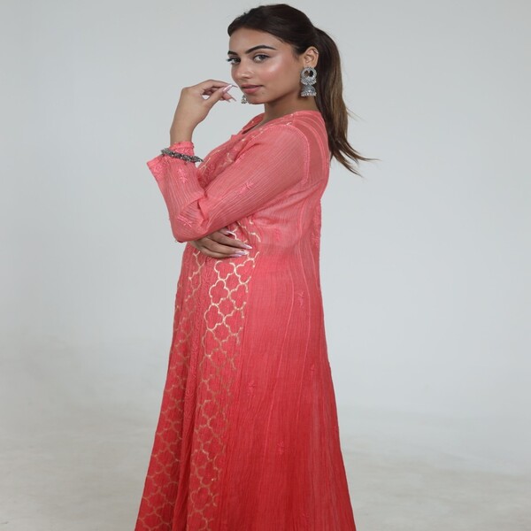 5850 Piece Description : A Chikankari Anarkali Is A Traditional Indian Outfit Featuring The Elegant Anarkali Silhouette Enhanced By Chikankari, A Delicate Hand Embroidery Technique From Lucknow. This Style Combines The Graceful, Floor-length Flow Of The Anarkali With The Intricate, Often White-on-pastel, Hand-stitched Patterns Of Chikankari, Creating A Dress That Is Both Classic And Sophisticated. Location : Uttar Pradesh, India