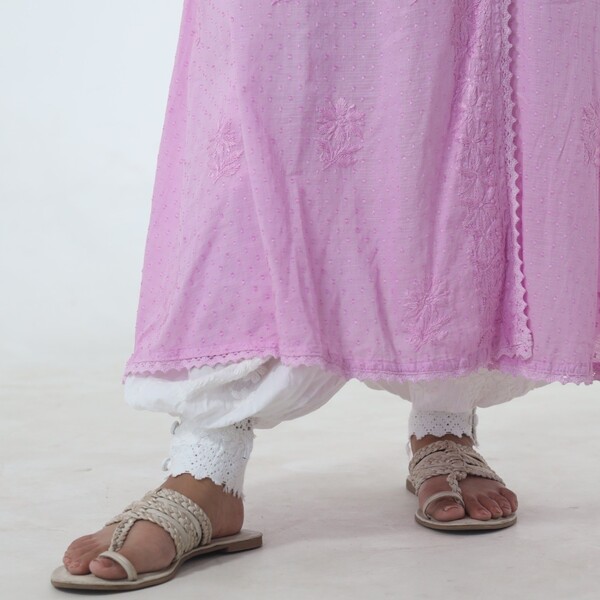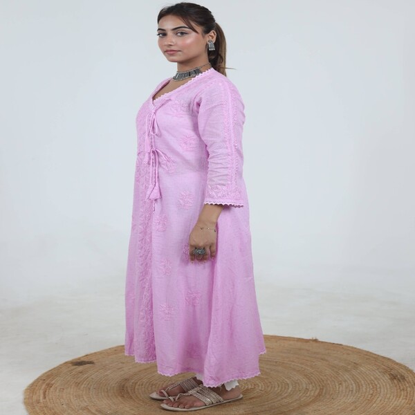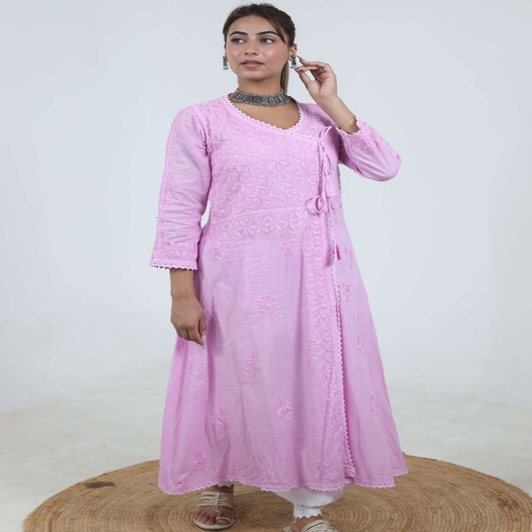 3899 Piece Description : A Chikankari Tie-up Angarkha Is A Traditional Indian Tunic That Elegantly Merges The Classic Wrap-around Angarkha Silhouette With The Intricate Hand-embroidery Of Chikankari From Lucknow. This Garment Features An Overlapping Front Panel Secured With A Side Tie, Often Adorned With Tassels, Creating A Flattering, Adjustable Fit. The Surface Is Richly Embellished With Delicate, Hand-stitched Patterns—such As Floral Motifs Created Using Traditional Stitches Like Bakhiya (shadow Work) And Phanda (knot Stitches). The Result Is A Sophisticated And Timeless Piece That Celebrates Artisanal Craftsmanship, Suitable For A Range Of Occasions From Casual Daytime Wear To Festive Evening Events. Location : Uttar Pradesh, India