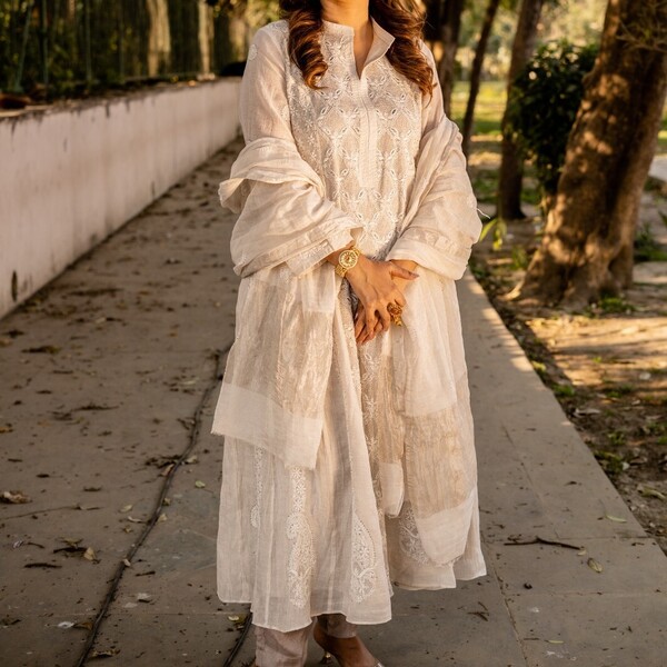 22100 Set Description : A Chikankari Silver Tissue Anarkali Is A Formal, Floor-length Anarkali Suit Made From Shimmering Silver Tissue Fabric, Featuring Traditional Hand-embroidered Chikankari Work, Often Enhanced With Embellishments Like Sequins Or Cutdana. It Has A Flowing, Flared Silhouette That Creates A Regal And Elegant Look, Suitable For Festive Occasions And Weddings. Location : Uttar Pradesh, India