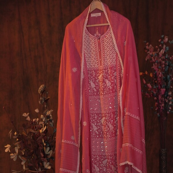 15600 Set Description : A Chikankari Unstitched Suit Set Is A Three-piece Outfit Comprising Unstitched Fabric For A Kurta, A Bottom, And A Dupatta, All Featuring Intricate Hand Embroidery. It Allows For A Custom Fit And Style, Often Embellished With Traditional Motifs Like Floral, Paisley, And Geometric Designs, Using Techniques Such As Bakhiya, Phanda, And Keel Kangan Stitches. The Fabric Is Typically Cotton, Georgette, Or Silk, Suitable For Both Casual And Formal Occasions. Location : Uttar Pradesh, India