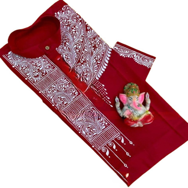 A Kalka Punjabi kurta is a mens long, loose-fitting tunic made of fabric like cotton or khadi cotton, often handcrafted with a Kalka or paisley-like embroidery or hand-painted design. The Kalka refers to the intricate pattern, which are hand-painted or embroidered, making it a decorative, festive, or formal ethnic wear option. Location : West Bengal, India