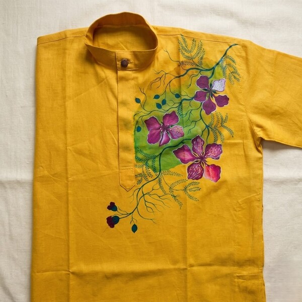 A Kalka Punjabi kurta is a mens long, loose-fitting tunic made of fabric like cotton or khadi cotton, often handcrafted with a Kalka or paisley-like embroidery or hand-painted design. The Kalka refers to the intricate pattern, which are hand-painted or embroidered, making it a decorative, festive, or formal ethnic wear option. Location : West Bengal, India