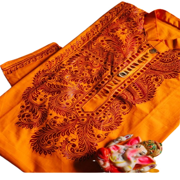 990 Piece Description : A Kalka Punjabi Kurta Is A Mens Long, Loose-fitting Tunic Made Of Fabric Like Cotton Or Khadi Cotton, Often Handcrafted With A Kalka Or Paisley-like Embroidery Or Hand-painted Design. The Kalka Refers To The Intricate Pattern, Which Are Hand-painted Or Embroidered, Making It A Decorative, Festive, Or Formal Ethnic Wear Option. Location : West Bengal, India