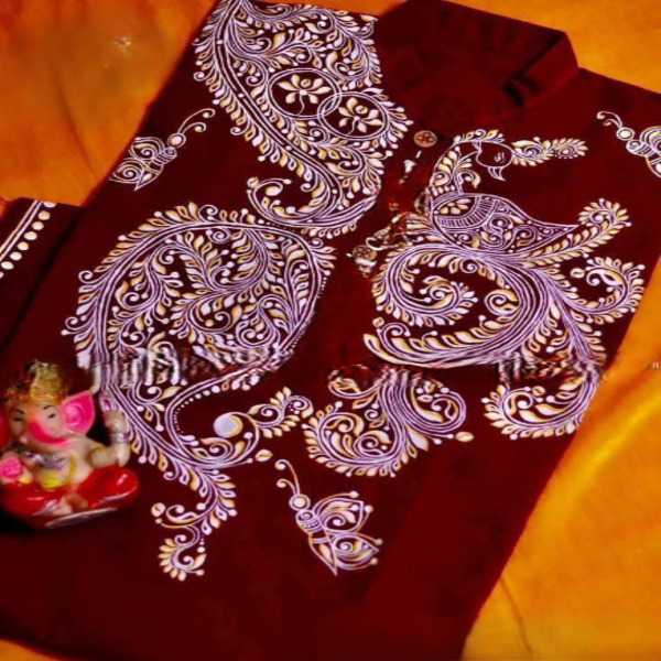 935 Piece Description : A Kalka Punjabi Kurta Is A Mens Long, Loose-fitting Tunic Made Of Fabric Like Cotton Or Khadi Cotton, Often Handcrafted With A Kalka Or Paisley-like Embroidery Or Hand-painted Design. The Kalka Refers To The Intricate Pattern, Which Are Hand-painted Or Embroidered, Making It A Decorative, Festive, Or Formal Ethnic Wear Option. Location : West Bengal, India