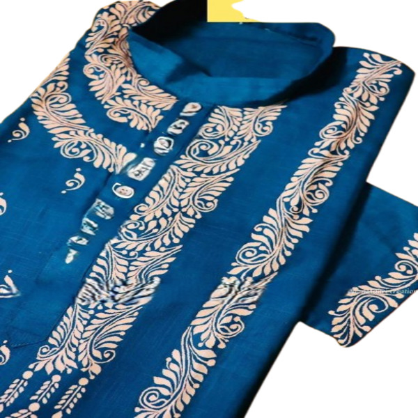 A Kalka Punjabi kurta is a mens long, loose-fitting tunic made of fabric like cotton or khadi cotton, often handcrafted with a Kalka or paisley-like embroidery or hand-painted design. The Kalka refers to the intricate pattern, which are hand-painted or embroidered, making it a decorative, festive, or formal ethnic wear option. Location : West Bengal, India