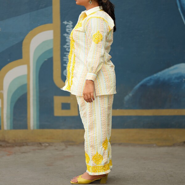 3850 Set Description : A Chikankari Crushed Co-ord Set Is A Stylish And Comfortable Two-piece Outfit That Elegantly Merges Traditional Indian Craftsmanship With A Modern, Relaxed Aesthetic. The Ensemble Features Intricate, Handcrafted Chikankari Embroidery, Typically Done In Delicate White Thread, Detailing Floral Or Traditional Motifs Across The Top And Bottom Pieces. The Unique Crushed Texture Of The Fabric—often A Soft, Breathable Cotton Or Rayon—provides A Distinct, Permanently Crinkled Look That Offers Ease Of Movement, Requires Minimal Care (no Ironing Needed), And Adds A Contemporary, Relaxed Flair To The Traditional Artistry. This Fusion Creates A Versatile Outfit Suitable For A Variety Of Occasions, From Casual Day Wear To Semi-formal Events. Location : Uttar Pradesh, India