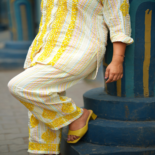 4550 Set Description : A Chikankari Crushed Co-ord Set Is A Stylish And Comfortable Two-piece Outfit That Elegantly Merges Traditional Indian Craftsmanship With A Modern, Relaxed Aesthetic. The Ensemble Features Intricate, Handcrafted Chikankari Embroidery, Typically Done In Delicate White Thread, Detailing Floral Or Traditional Motifs Across The Top And Bottom Pieces. The Unique Crushed Texture Of The Fabric—often A Soft, Breathable Cotton Or Rayon—provides A Distinct, Permanently Crinkled Look That Offers Ease Of Movement, Requires Minimal Care (no Ironing Needed), And Adds A Contemporary, Relaxed Flair To The Traditional Artistry. This Fusion Creates A Versatile Outfit Suitable For A Variety Of Occasions, From Casual Day Wear To Semi-formal Events. Location : Uttar Pradesh, India