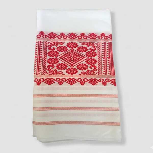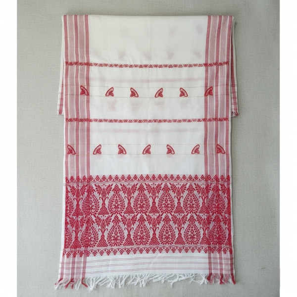 A pure toss gamosa is a handwoven Assamese scarf made from luxurious, golden Muga silk (a type of silk) rather than the typical cotton. Known for its intricate, decorative woven patterns, often in red, the pure toss gamosa is an essential cultural emblem in Assam, used as a symbol of deep respect, dignity, and tradition, and worn during special occasions and ceremonies. Location : Assam, India