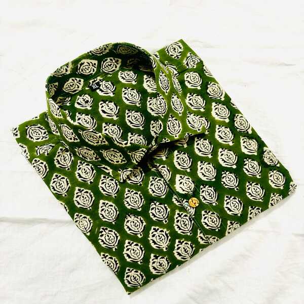 550 Piece Description : A Hand Block Printed Cotton Shirt Is Made From Comfortable, Natural Cotton Fabric Decorated With Designs Carved Onto Wooden Blocks By Skilled Artisans. Each Block Is Used To Press A Specific Color Onto The Fabric With Precision, Creating Intricate, Unique Patterns With Slight Irregularities That Highlight The Artisanal, Handmade Nature Of The Shirt. These Shirts Are A Blend Of Traditional Craftsmanship And Modern Style, Often Featuring Traditional Motifs, And Are Prized For Their Breathability And Lightweight Feel. Location : Rajasthan, India