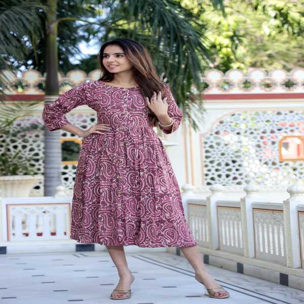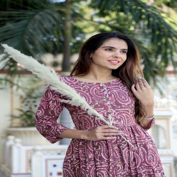 743 Piece Description : A Bagru Hand-block Printed Long One-piece Dress Is A Traditionally Crafted Garment From Rajasthan, India, Made With Eco-friendly Techniques And Natural Dyes. Skilled Artisans, Known As Chippas, Use Hand-carved Wooden Blocks To Stamp Intricate, Earthy-toned Motifs—often Inspired By Nature Or Geometric Patterns—onto Breathable Fabrics Like Cotton Cambric. The Distinctive Patterns Are Created Through A Time-honoured Process That Can Include The Mud-resist (dabu) Printing Method Before The Fabric Is Dyed. This Results In A Comfortable, Lightweight Dress With A Timeless Appeal That Showcases Authentic Craftsmanship. Location : Rajasthan, India