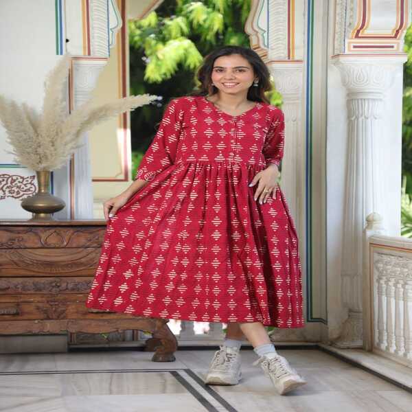 A Bagru hand-block printed long one-piece dress is a traditionally crafted garment from Rajasthan, India, made with eco-friendly techniques and natural dyes. Skilled artisans, known as Chippas, use hand-carved wooden blocks to stamp intricate, earthy-toned motifs—often inspired by nature or geometric patterns—onto breathable fabrics like cotton cambric. The distinctive patterns are created through a time-honoured process that can include the mud-resist (Dabu) printing method before the fabric is dyed. This results in a comfortable, lightweight dress with a timeless appeal that showcases authentic craftsmanship. Location : Rajasthan, India