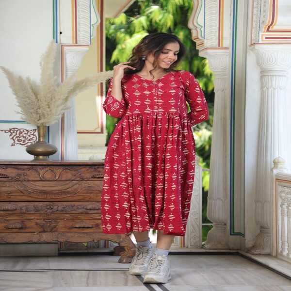 A Bagru hand-block printed long one-piece dress is a traditionally crafted garment from Rajasthan, India, made with eco-friendly techniques and natural dyes. Skilled artisans, known as Chippas, use hand-carved wooden blocks to stamp intricate, earthy-toned motifs—often inspired by nature or geometric patterns—onto breathable fabrics like cotton cambric. The distinctive patterns are created through a time-honoured process that can include the mud-resist (Dabu) printing method before the fabric is dyed. This results in a comfortable, lightweight dress with a timeless appeal that showcases authentic craftsmanship. Location : Rajasthan, India