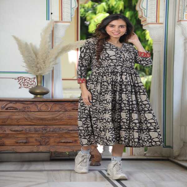 A Bagru hand-block printed long one-piece dress is a traditionally crafted garment from Rajasthan, India, made with eco-friendly techniques and natural dyes. Skilled artisans, known as Chippas, use hand-carved wooden blocks to stamp intricate, earthy-toned motifs—often inspired by nature or geometric patterns—onto breathable fabrics like cotton cambric. The distinctive patterns are created through a time-honoured process that can include the mud-resist (Dabu) printing method before the fabric is dyed. This results in a comfortable, lightweight dress with a timeless appeal that showcases authentic craftsmanship. Location : Rajasthan, India
