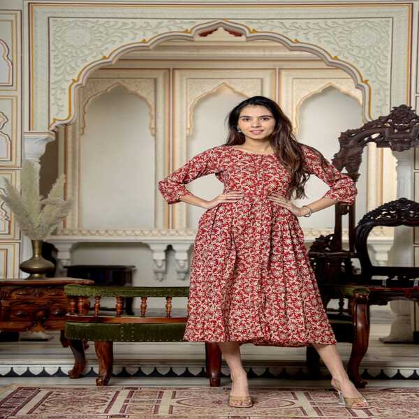 A Bagru hand-block printed long one-piece dress is a traditionally crafted garment from Rajasthan, India, made with eco-friendly techniques and natural dyes. Skilled artisans, known as Chippas, use hand-carved wooden blocks to stamp intricate, earthy-toned motifs—often inspired by nature or geometric patterns—onto breathable fabrics like cotton cambric. The distinctive patterns are created through a time-honoured process that can include the mud-resist (Dabu) printing method before the fabric is dyed. This results in a comfortable, lightweight dress with a timeless appeal that showcases authentic craftsmanship. Location : Rajasthan, India