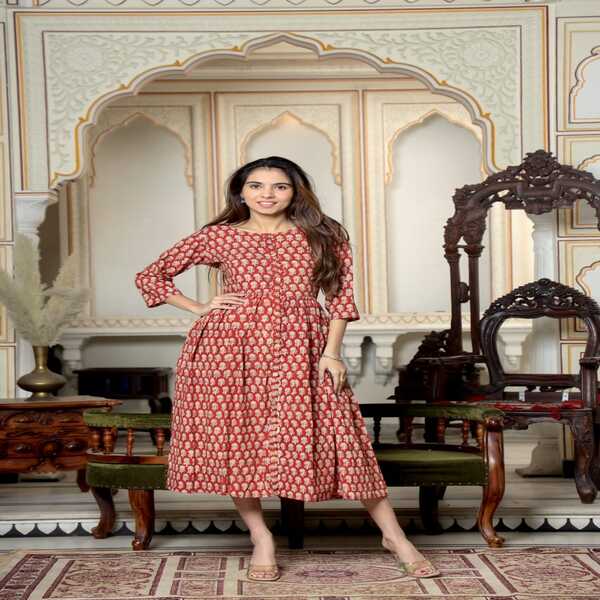 A Bagru hand-block printed long one-piece dress is a traditionally crafted garment from Rajasthan, India, made with eco-friendly techniques and natural dyes. Skilled artisans, known as Chippas, use hand-carved wooden blocks to stamp intricate, earthy-toned motifs—often inspired by nature or geometric patterns—onto breathable fabrics like cotton cambric. The distinctive patterns are created through a time-honored process that can include the mud-resist (Dabu) printing method before the fabric is dyed. This results in a comfortable, lightweight dress with a timeless appeal that showcases authentic craftsmanship. Location : Rajasthan, India
