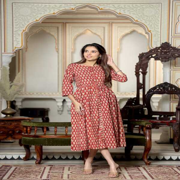 A Bagru hand-block printed long one-piece dress is a traditionally crafted garment from Rajasthan, India, made with eco-friendly techniques and natural dyes. Skilled artisans, known as Chippas, use hand-carved wooden blocks to stamp intricate, earthy-toned motifs—often inspired by nature or geometric patterns—onto breathable fabrics like cotton cambric. The distinctive patterns are created through a time-honored process that can include the mud-resist (Dabu) printing method before the fabric is dyed. This results in a comfortable, lightweight dress with a timeless appeal that showcases authentic craftsmanship. Location : Rajasthan, India