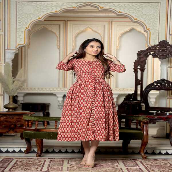 A Bagru hand-block printed long one-piece dress is a traditionally crafted garment from Rajasthan, India, made with eco-friendly techniques and natural dyes. Skilled artisans, known as Chippas, use hand-carved wooden blocks to stamp intricate, earthy-toned motifs—often inspired by nature or geometric patterns—onto breathable fabrics like cotton cambric. The distinctive patterns are created through a time-honored process that can include the mud-resist (Dabu) printing method before the fabric is dyed. This results in a comfortable, lightweight dress with a timeless appeal that showcases authentic craftsmanship. Location : Rajasthan, India