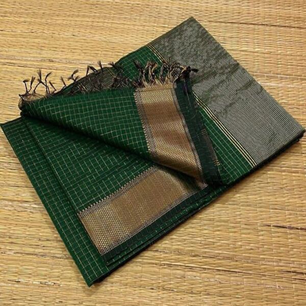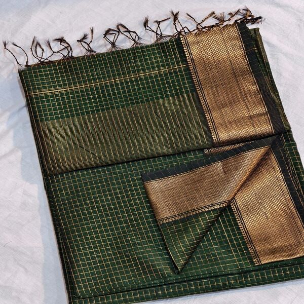 4950 Piece Description : A Maheshwari Zari Checks Saree Is A Lightweight, Handwoven Saree Made From A Blend Of Silk And Cotton, Known For Its Elegant Drape And Intricate Golden Zari Check Patterns. It Typically Features A Distinctive Geometric Design With A Contrasting Border, A Unique Pallu Often With Multiple Colored Stripes, And Is A Classic Fusion Of Traditional Craftsmanship And Contemporary Style. Location : Madhya Pradesh, India