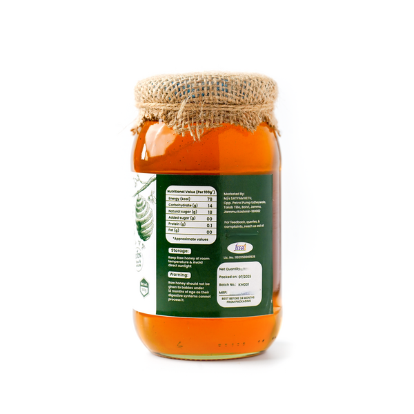 Purity is preserved, we ensure this forest honey stays wholesome and authentic. No added sugar, no preservatives—just raw honey filtered traditionally to safeguard its natural purity. Ethically harvested with nature-respecting methods, our Multiflora Wild Honey reflects the richness of Himalayan flora, making it an artisanal choice for those seeking organic honey with a healthful, floral taste. Location : Jammu & Kashmir, India