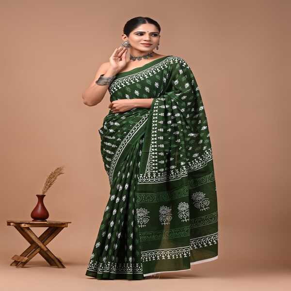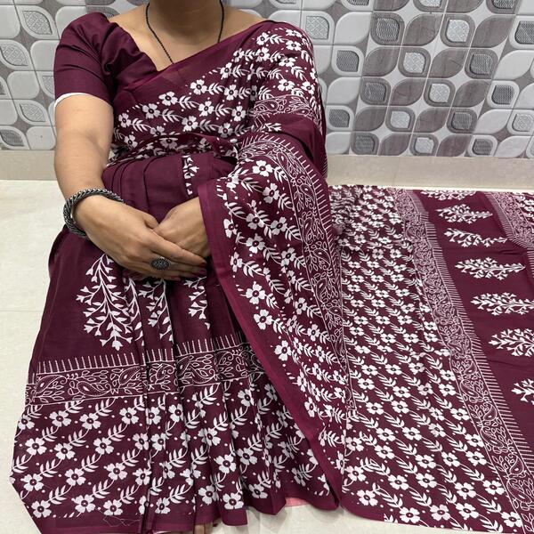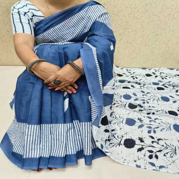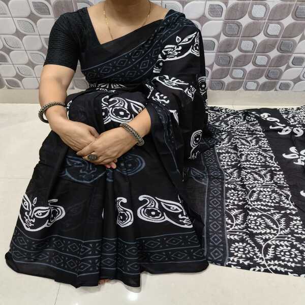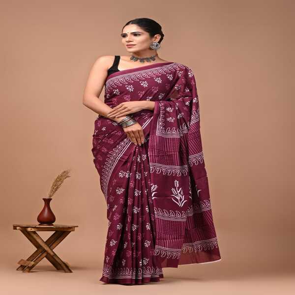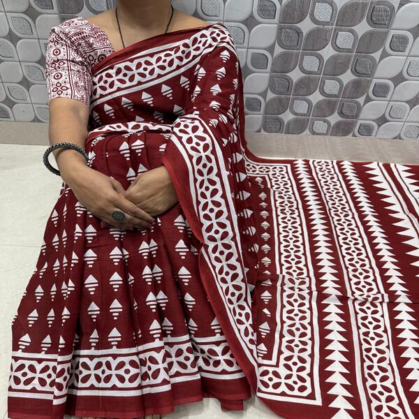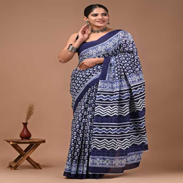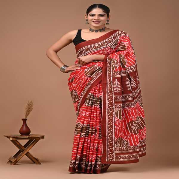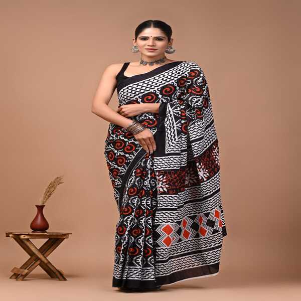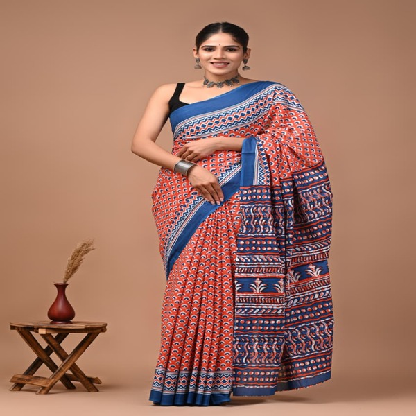 494 Piece Description : A Bagru Hand Block Printed Cotton Mulmul Saree Is A Lightweight Breathable Saree Crafted Using Traditional Indian Textile Techniques From The Village Of Bagru In Rajasthan. It Is Made From Mulmul Cotton A Very Fine Soft And Sheer Variety Of Cotton Known For Its Comfort And Airy Feel Making The Saree Ideal For Warm Weather The Fabric Drapes Gently And Feels Smooth Against The Skin. The Saree Features Hand Block Printing Where Skilled Artisans Carve Intricate Floral Paisley Or Geometric Motifs Onto Wooden Blocks And Stamp Them Onto The Fabric Using Natural Or Vegetable-based Dyes Typical Bagru Designs Use Earthy Colours Such As Indigo Red Black And Beige Often Inspired By Nature And Traditional Rajasthani Patterns. Location : Rajasthan, India