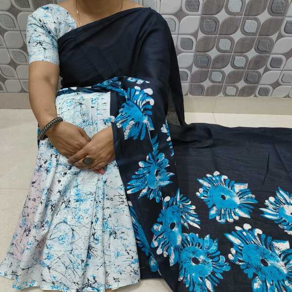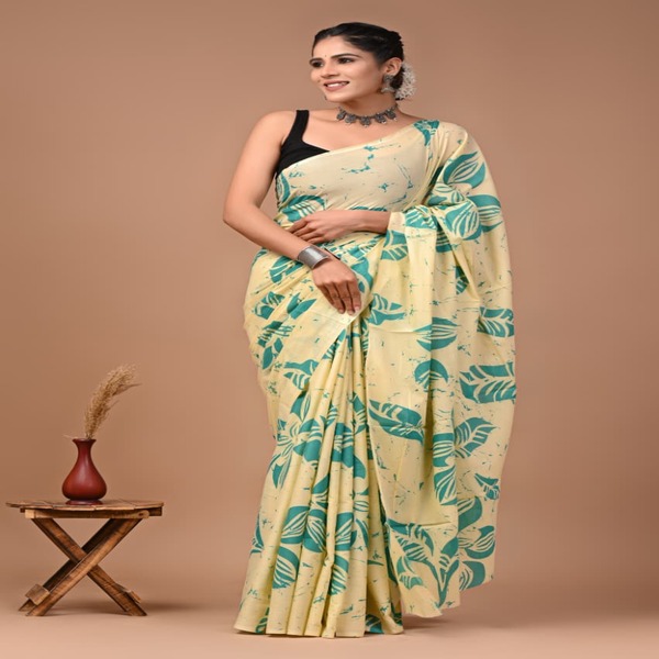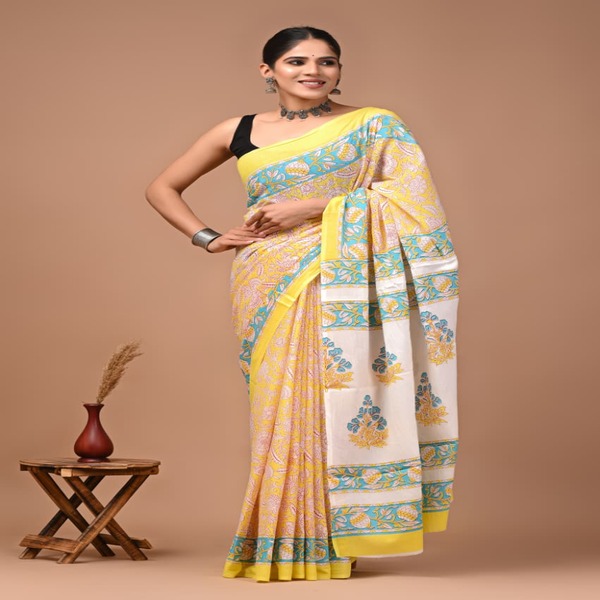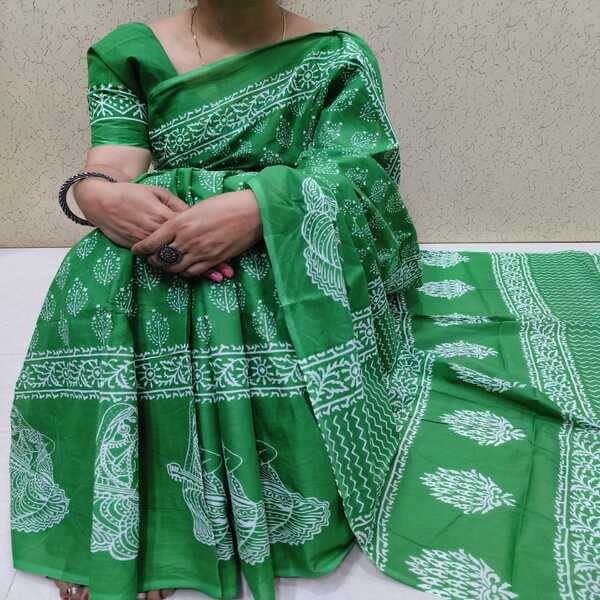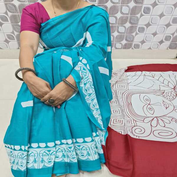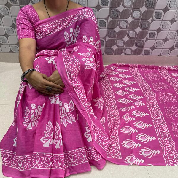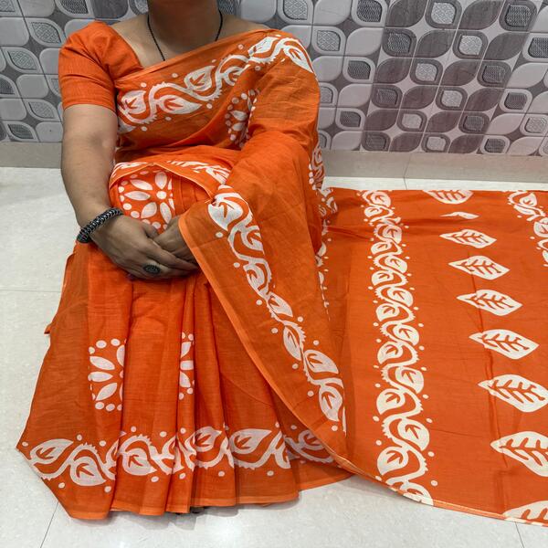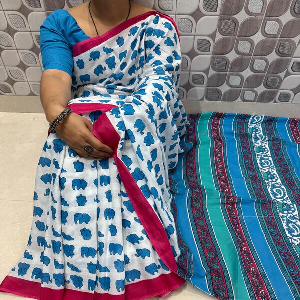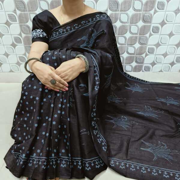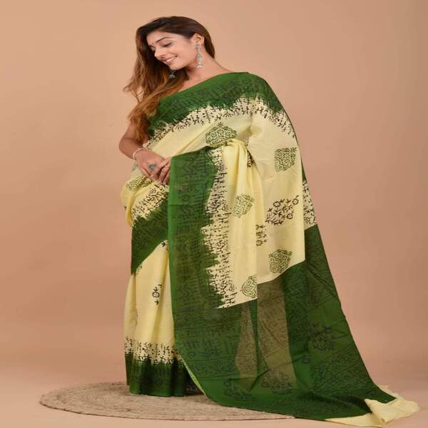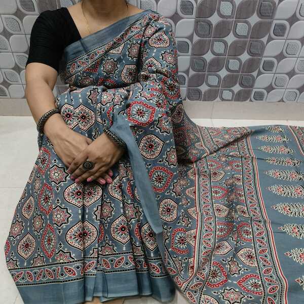494 Piece Description : A Bagru Hand Block Printed Cotton Mulmul Saree Is A Lightweight Breathable Saree Crafted Using Traditional Indian Textile Techniques From The Village Of Bagru In Rajasthan. It Is Made From Mulmul Cotton A Very Fine Soft And Sheer Variety Of Cotton Known For Its Comfort And Airy Feel Making The Saree Ideal For Warm Weather The Fabric Drapes Gently And Feels Smooth Against The Skin. The Saree Features Hand Block Printing Where Skilled Artisans Carve Intricate Floral Paisley Or Geometric Motifs Onto Wooden Blocks And Stamp Them Onto The Fabric Using Natural Or Vegetable-based Dyes Typical Bagru Designs Use Earthy Colours Such As Indigo Red Black And Beige Often Inspired By Nature And Traditional Rajasthani Patterns. Location : Rajasthan, India