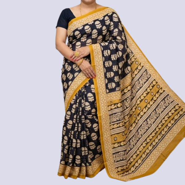 A Bagru hand block printed cotton mulmul saree is a lightweight breathable saree crafted using traditional Indian textile techniques from the village of Bagru in Rajasthan. It is made from mulmul cotton a very fine soft and sheer variety of cotton known for its comfort and airy feel making the saree ideal for warm weather The fabric drapes gently and feels smooth against the skin. The saree features hand block printing where skilled artisans carve intricate floral paisley or geometric motifs onto wooden blocks and stamp them onto the fabric using natural or vegetable-based dyes Typical Bagru designs use earthy colours such as indigo red black and beige often inspired by nature and traditional Rajasthani patterns. Location : Rajasthan, India