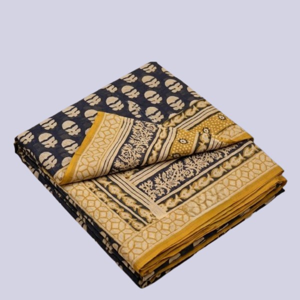 A Bagru hand block printed cotton mulmul saree is a lightweight breathable saree crafted using traditional Indian textile techniques from the village of Bagru in Rajasthan. It is made from mulmul cotton a very fine soft and sheer variety of cotton known for its comfort and airy feel making the saree ideal for warm weather The fabric drapes gently and feels smooth against the skin. The saree features hand block printing where skilled artisans carve intricate floral paisley or geometric motifs onto wooden blocks and stamp them onto the fabric using natural or vegetable-based dyes Typical Bagru designs use earthy colours such as indigo red black and beige often inspired by nature and traditional Rajasthani patterns. Location : Rajasthan, India