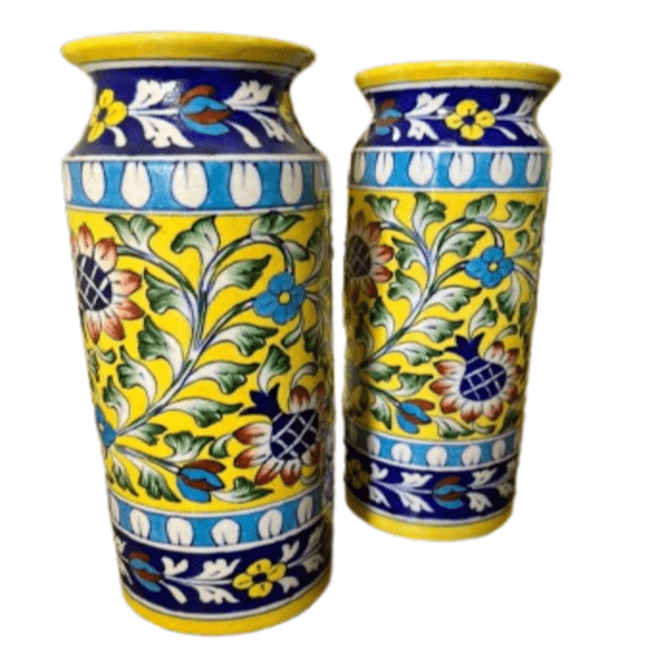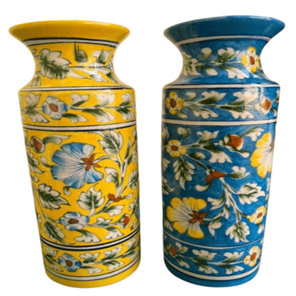 A blue art pottery vase is typically a decorative ceramic vessel, often handcrafted with intricate, hand-painted blue designs set against a lighter background, most famously associated with the traditional crafts of Jaipur, India. These vases are fragile due to a low-temperature firing process and are made from a mix of quartz, powdered glass, and other materials, rather than clay. They are a popular choice for home décor, as both functional flower holders and standalone decorative pieces. Location : Rajasthan, India