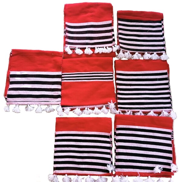 330 Piece Description : A Mising Muffler, Or Erpob, Is A Traditional Handwoven Accessory From The Mising Tribe Of Assam, India, Typically Made From Cotton Or Wool. It Is Characterized By A Distinctive Design Of Cross Stripes, Often In Red With Black, White, And Yellow, And Is Worn By Both Men And Women For Warmth Or Fashion. It Is An Important Part Of The Mising Peoples Traditional Attire And Is Sometimes Used As A Gift During Festivals Like Bihu. Location : Assam, India