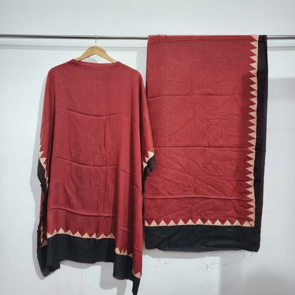 A hand block printed Ajrakh modal saree is a hand-crafted textile featuring intricate, geometric or floral patterns, created using traditional wooden blocks and natural dyes on a fabric blend of modal and rayon-cotton. The process involves layering blocks, with each colour and pattern applied separately, and requires multiple rounds of printing and sun-drying. The resulting saree is known for its soft drape, unique earthy and bold aesthetic, and the unique variations that come from being entirely handmade. Due to the handmade nature of the process, each saree has slight variations, making it a unique piece of wearable art. Location : Gujarat, India