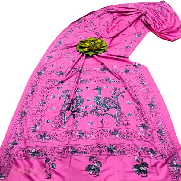 1705 Piece Description : A Traditional Kantha Stitch Saree Is A Celebrated Handloom Textile Originating From The Bengal Region (west Bengal And Bangladesh), Instantly Recognizable By Its Meticulous And Distinct Use Of The Simple Running Stitch (known As The Kantha Stitch) To Create Elaborate Patterns And Motifs. Originally A Sustainable Craft Where Rural Women Layered And Stitched Together Old Cotton Sarees And Dhotis To Create Serviceable Quilts (known As Gudris), The Technique Has Evolved Into A Sophisticated Art Form Applied To New Silk, Tussar Silk, Or Cotton Fabrics. The Charm Of A Traditional Kantha Saree Lies In The Intricate, Often Narrative, Embroidery Depicting Folk Tales, Mythological Symbols, And Scenes Of Daily Life, Making Each Piece A Unique Work Of Art That Tells A Story And Preserves A Rich Cultural Heritage. Location : West Bengal, India