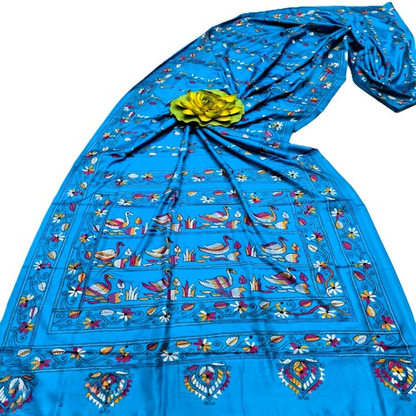 1705 Piece Description : A Traditional Kantha Stitch Saree Is A Celebrated Handloom Textile Originating From The Bengal Region (west Bengal And Bangladesh), Instantly Recognizable By Its Meticulous And Distinct Use Of The Simple Running Stitch (known As The Kantha Stitch) To Create Elaborate Patterns And Motifs. Originally A Sustainable Craft Where Rural Women Layered And Stitched Together Old Cotton Sarees And Dhotis To Create Serviceable Quilts (known As Gudris), The Technique Has Evolved Into A Sophisticated Art Form Applied To New Silk, Tussar Silk, Or Cotton Fabrics. The Charm Of A Traditional Kantha Saree Lies In The Intricate, Often Narrative, Embroidery Depicting Folk Tales, Mythological Symbols, And Scenes Of Daily Life, Making Each Piece A Unique Work Of Art That Tells A Story And Preserves A Rich Cultural Heritage. Location : West Bengal, India