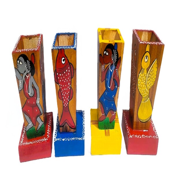 A hand-painted Pattachitra wooden pen stand is a functional, handcrafted desk accessory that serves as a canvas for the vibrant and intricate traditional Pattachitra folk art of Odisha, India. Each piece is unique, reflecting the skilled craftsmanship and cultural heritage of local artisans. The primary feature is the meticulous Pattachitra artwork, known for its fine detailing and storytelling visuals inspired by Hindu mythology and daily village life. Artisans use a rich, multicolour palette with popular motifs including tribal women, birds, flowers, and depictions of Hindu deities like Lord Jagannath, Radha, and Krishna. Crafted from high-quality, sustainable wood, these stands are robust, long-lasting, and finished with a protective topcoat to ensure the artwork is durable for daily use. Beyond being an organization tool for pens and pencils, the blend of utility and cultural artistry makes it a thoughtful, decorative gift for any home or office. Location : West Bengal, India