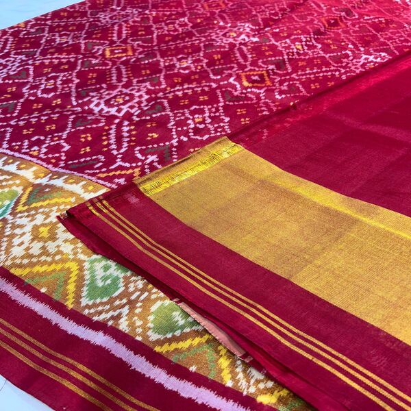 10450 Piece Description : Patola Silk Sarees Are Luxurious, Handwoven Masterpieces From Patan, Gujarat, Renowned For Their Vibrant Colours, Intricate Geometric Patterns, And Complex Double-ikat Technique Where Both Warp And Weft Threads Are Tie-dyed Before Weaving. These Durable, Reversible Sarees Feature Rich, Fade-resistant Natural Dyes And Traditional Motifs Like Elephants, Parrots, And Flowers. Patola Sarees Are Often Considered Heirlooms Due To Their Durability, High-quality, And Timeless, Reversible Designs. Location : Gujarat, India