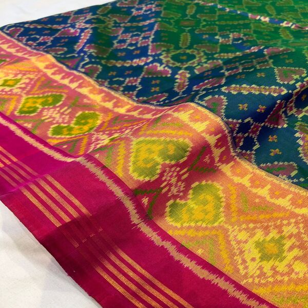 10450 Piece Description : Patola Silk Sarees Are Luxurious, Handwoven Masterpieces From Patan, Gujarat, Renowned For Their Vibrant Colours, Intricate Geometric Patterns, And Complex Double-ikat Technique Where Both Warp And Weft Threads Are Tie-dyed Before Weaving. These Durable, Reversible Sarees Feature Rich, Fade-resistant Natural Dyes And Traditional Motifs Like Elephants, Parrots, And Flowers. Patola Sarees Are Often Considered Heirlooms Due To Their Durability, High-quality, And Timeless, Reversible Designs. Location : Gujarat, India