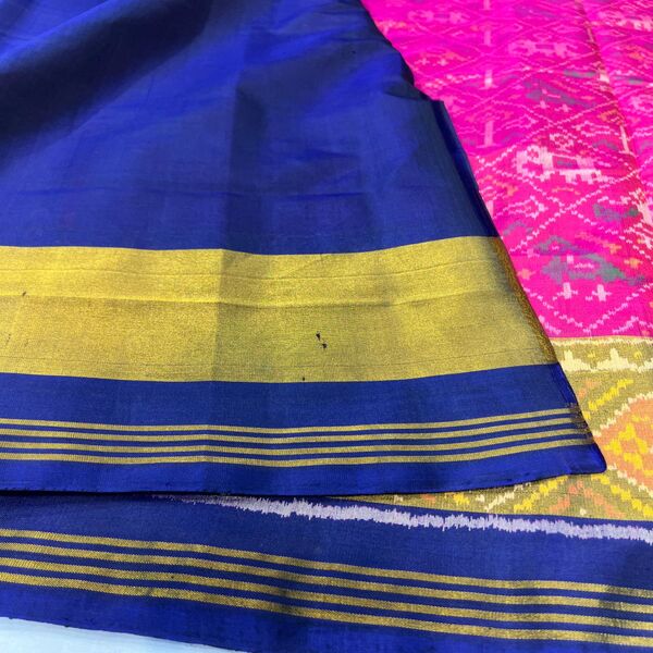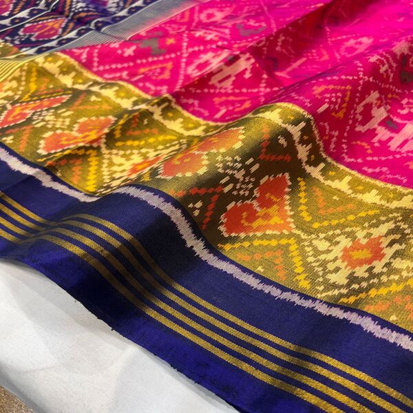 10450 Piece Description : Patola Silk Sarees Are Luxurious, Handwoven Masterpieces From Patan, Gujarat, Renowned For Their Vibrant Colours, Intricate Geometric Patterns, And Complex Double-ikat Technique Where Both Warp And Weft Threads Are Tie-dyed Before Weaving. These Durable, Reversible Sarees Feature Rich, Fade-resistant Natural Dyes And Traditional Motifs Like Elephants, Parrots, And Flowers. Patola Sarees Are Often Considered Heirlooms Due To Their Durability, High-quality, And Timeless, Reversible Designs. Location : Gujarat, India