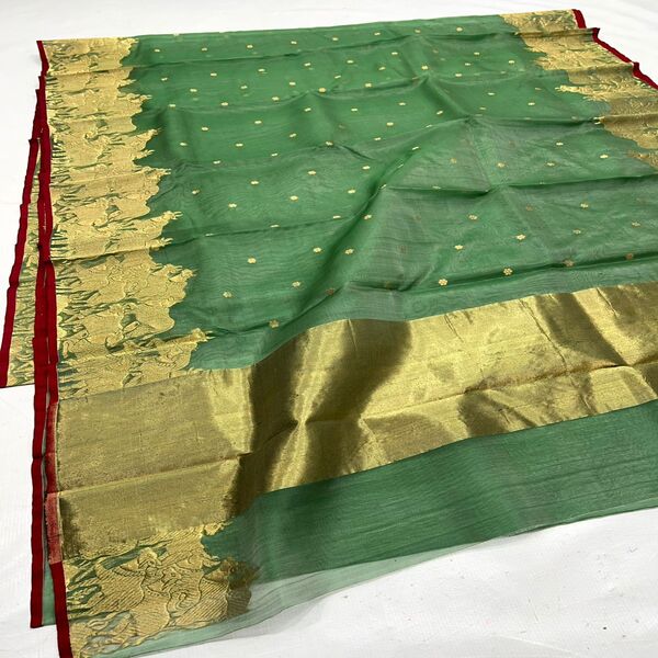 18150 Piece Description : A Pure Handloom Chanderi Saree Is A Lightweight, Sheer, And Soft Saree Woven On A Handloom From Fine Silk Or Cotton, Known For Its Subtle Shimmer, Delicate Feel, And Elegant Drape, Featuring Hand-woven Motifs (like Butis, Peacocks, Florals) And Intricate Zari Work, Offering Understated Luxury Perfect For Festive Occasions. Key Identifiers Are Its Feather-light Weight, Transparent Texture, Woven-in Designs, Firm Selvedge, And Subtle Glow, Distinct From Power Looms By Slight Imperfections And Hand-feel. Location : Madhya Pradesh, India