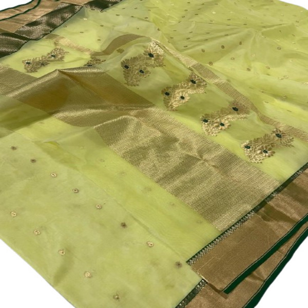 8250 Piece Description : A Chanderi Handloom Katan Silk Saree Is A Luxurious, Lightweight Saree From Chanderi, Madhya Pradesh, Known For Its Blend Of Fine Silk (katan) Threads Woven On A Handloom, Creating A Subtle Sheen, Soft Texture, And Durability, Often Featuring Traditional Motifs Like Coins, Flowers, Or Peacocks With Intricate Zari Work, Perfect For Festive Elegance. It Combines The Lightness Of Chanderi Fabric With The Richness Of Pure, Twisted Silk (katan), Showcasing Traditional Craftsmanship With Unique Patterns And A Distinct Luster, Making It A Prized Heirloom Piece. Location : Madhya Pradesh, India