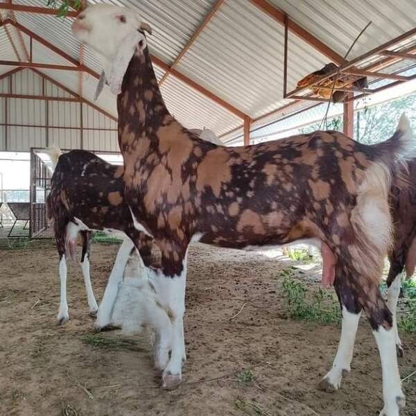 The Gujri goat is a large, robust, dual-purpose breed from Rajasthan, India, known for its distinctive brown and white colouring (often with white faces/legs), long drooping ears, and docile nature, making it popular for both meat and milk, characterized by good growth, resilience, and high fertility, suitable for small-scale farming. Location : Rajasthan, India