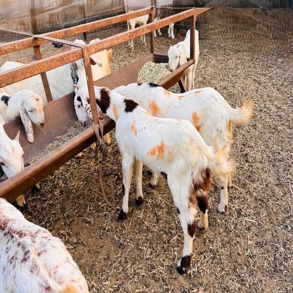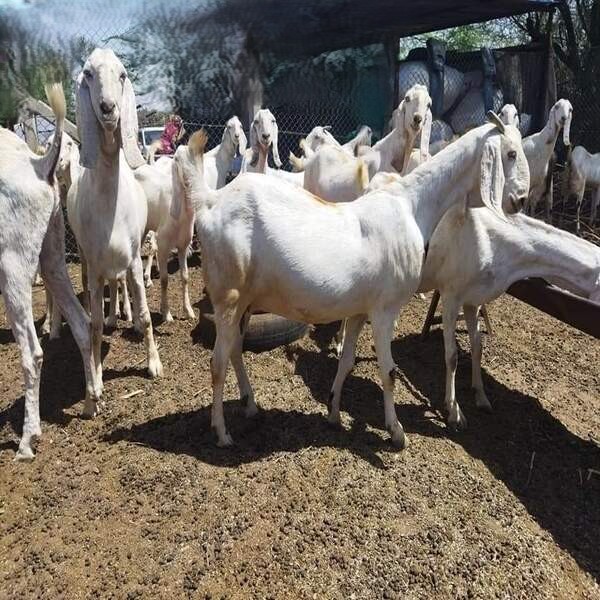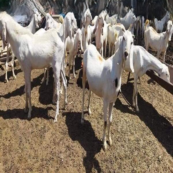 Sojat female goats are known for their distinct appearance, typically white with long, flat, drooping ears, short tails, and sometimes small, curved horns, bred mainly for high-quality meat in Rajasthan, India, featuring good muscle, a pinkish skin, and a well-developed udder with conical teats, providing good carcass yield. Primarily a meat-type breed, valued for high-quality, tender meat, though milk yield is low, they are Efficient breeders, often giving birth to single or twin kids and are Adaptable to harsh, hot environments with scarce water and food. In essence, Sojat does are robust, distinctive-looking goats prized for their meat, characterized by their striking white colour and very long, droopy ears.