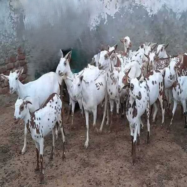 Barbari goats are a popular, dual-purpose (milk and meat) breed known for their adaptability, prolificacy (often twinning), and docility, characterized by a compact body, short coat (usually white with brown spots), medium-sized twisted horns, and unique features like long, upward-pointing ears and a distinct beard, making them ideal for intensive farming in semi-arid regions of India and Pakistan. Location : Rajasthan, India